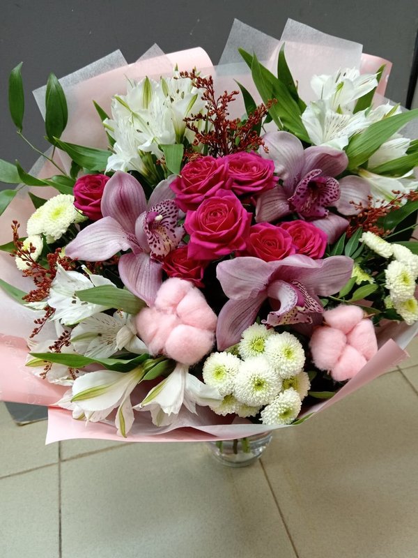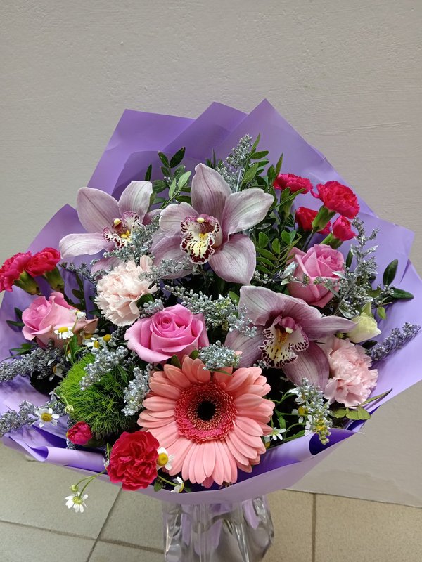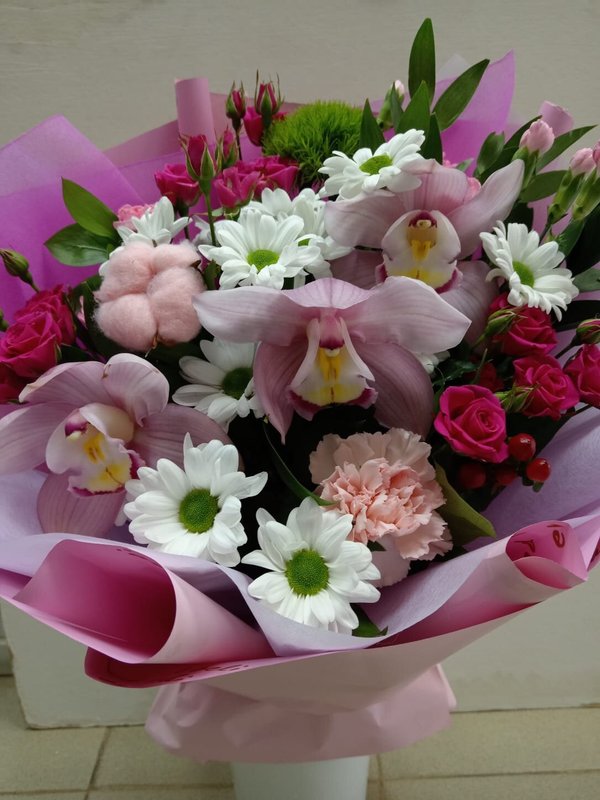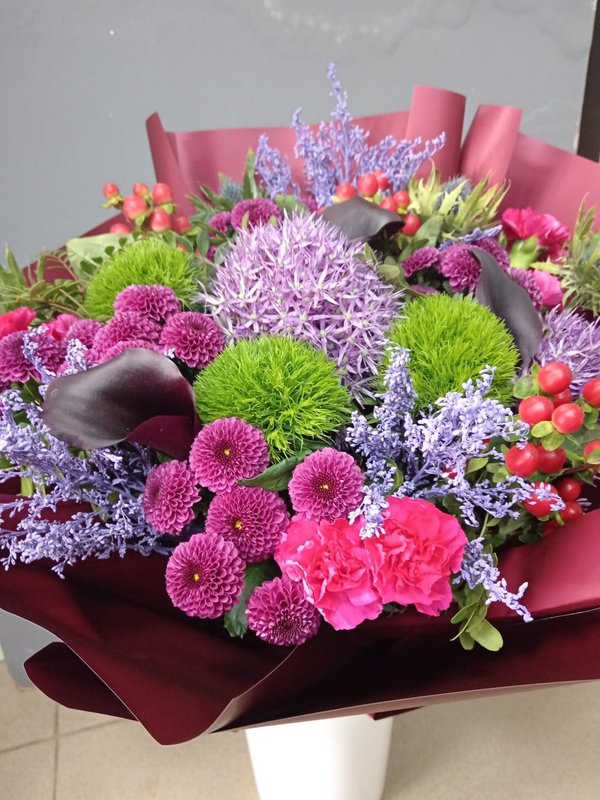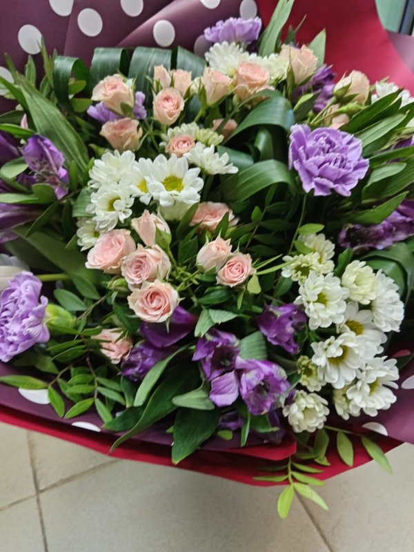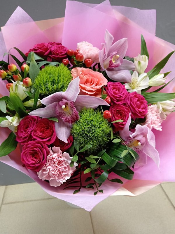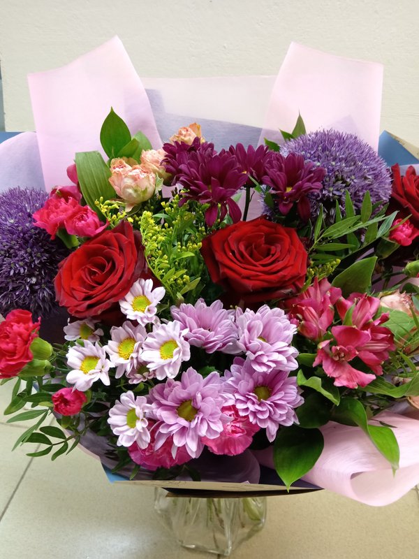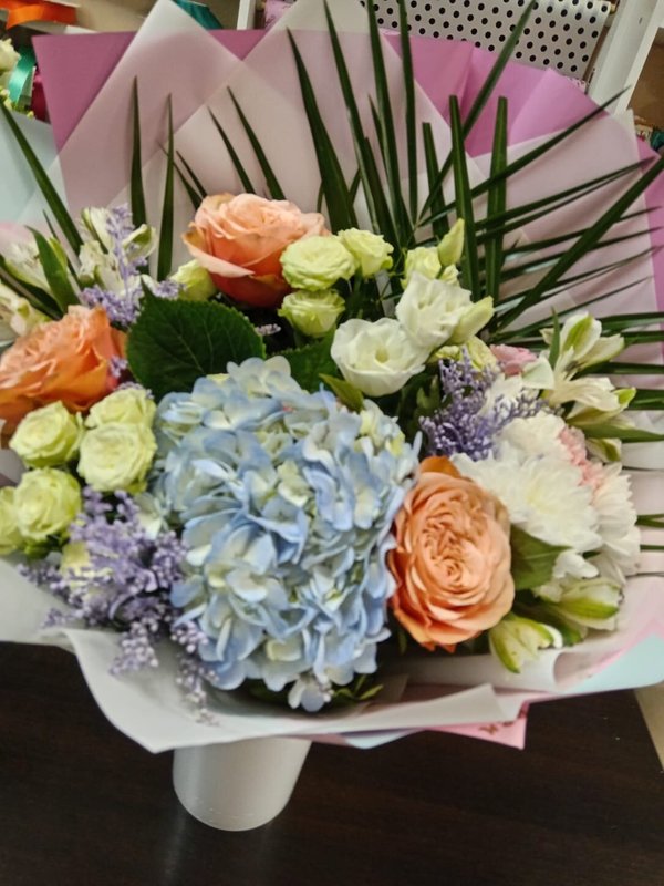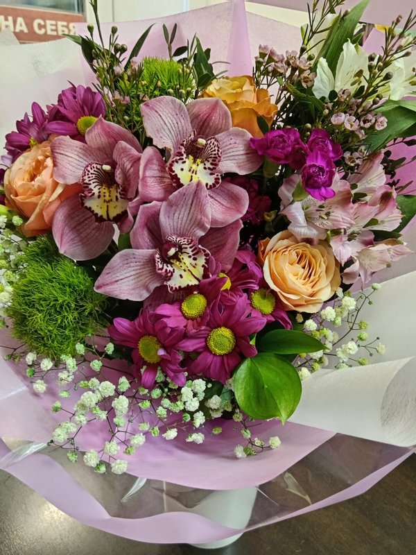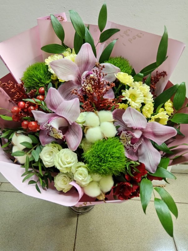 В магазине получил хорошее и дружелюбное отношение флориста, он сразу понял, что я хочу и сразу довольно быстро оформил букет. Букет на день рождения покупал, принёс фото и мне собрали что-то похожее из разных цветов. Каких-то растений не было в наличии, но флорист их заменил на другие и букет получился не менее красивым.