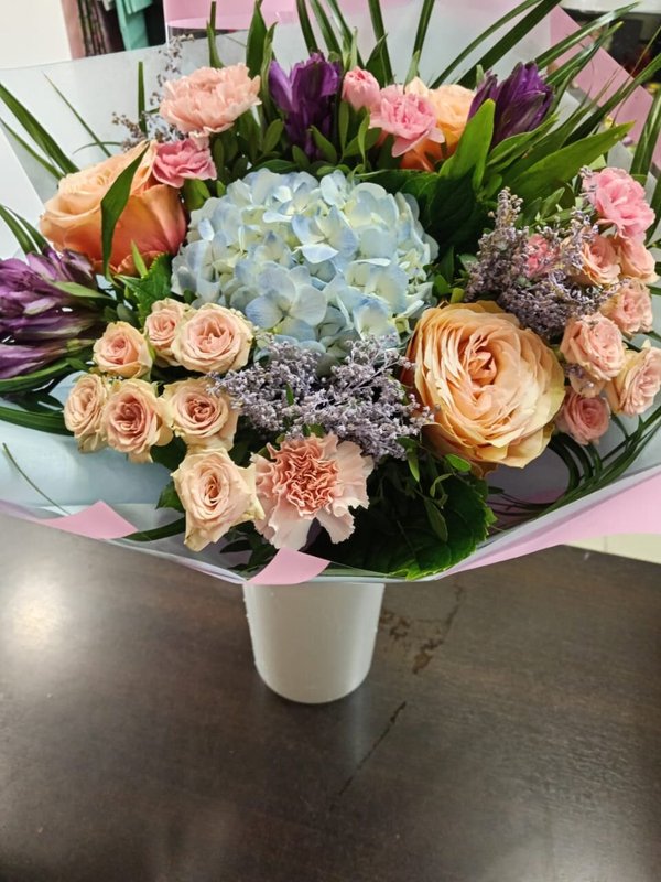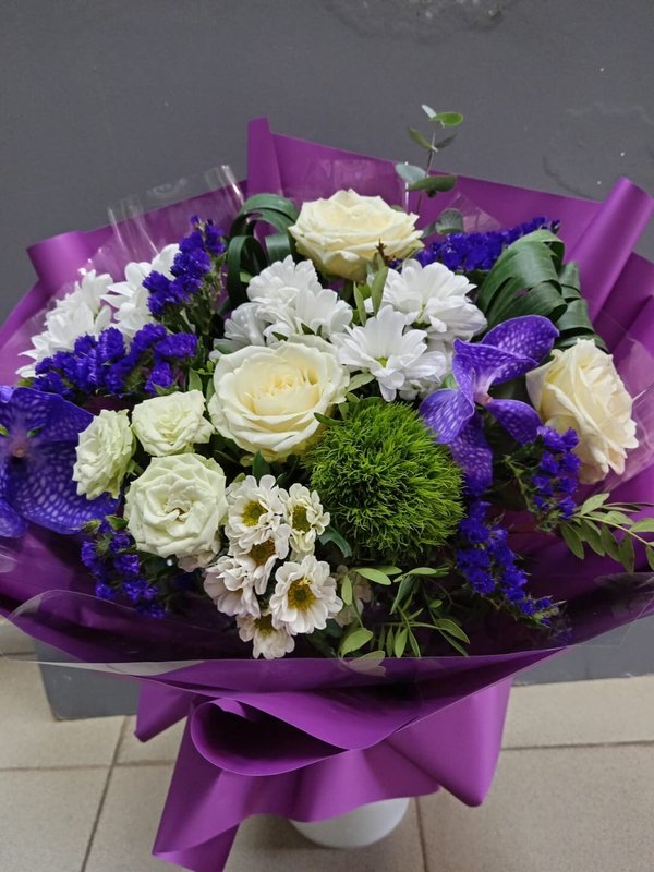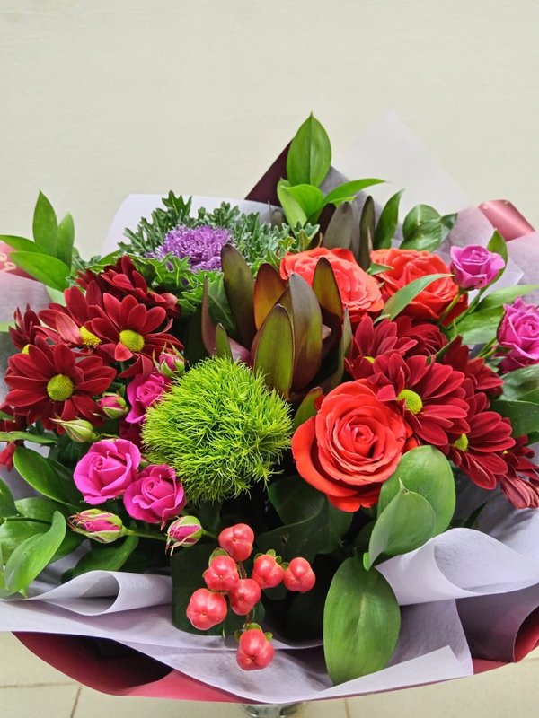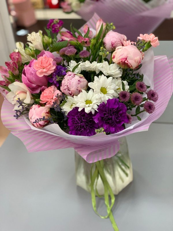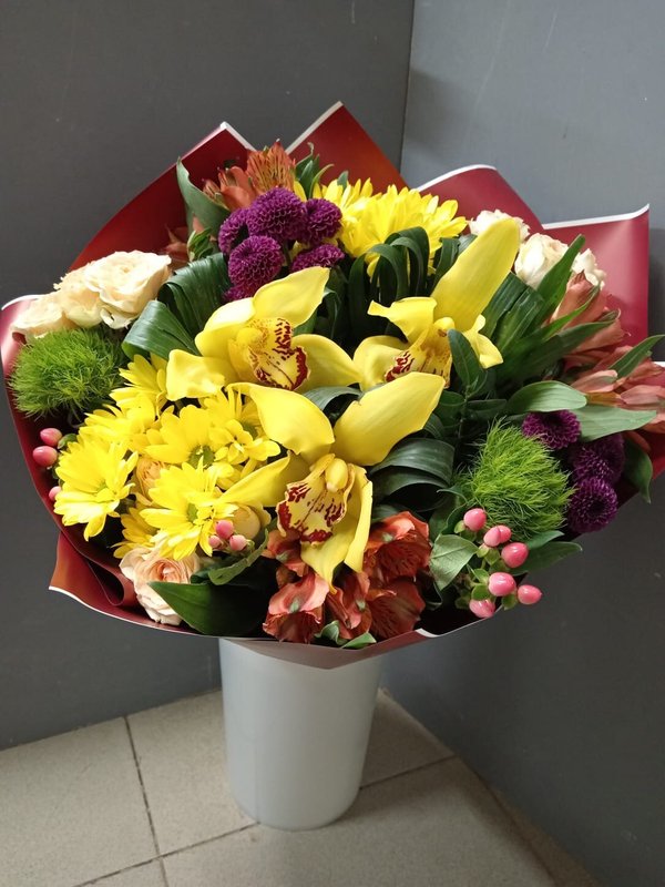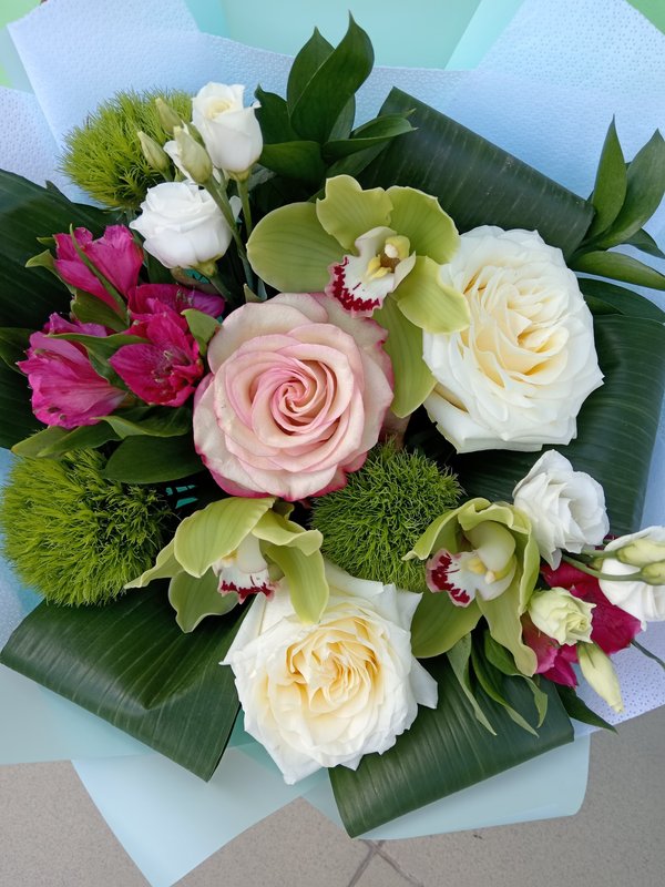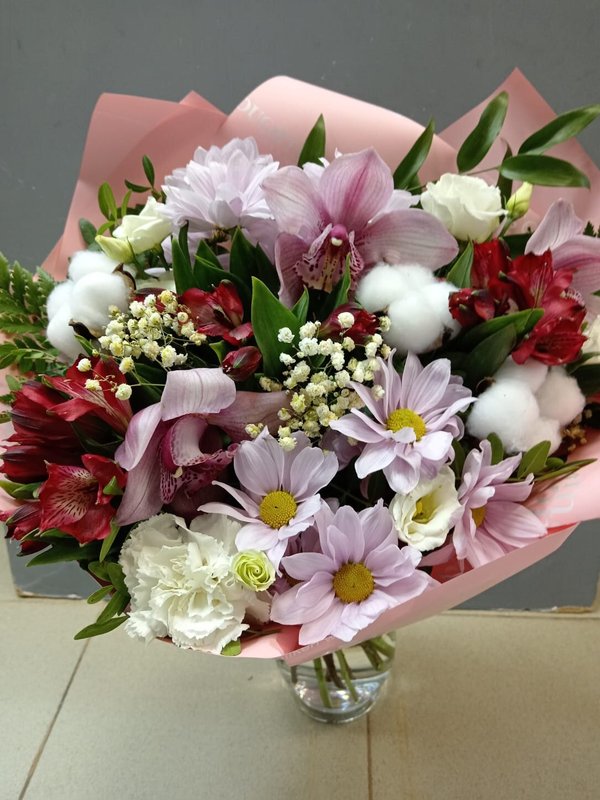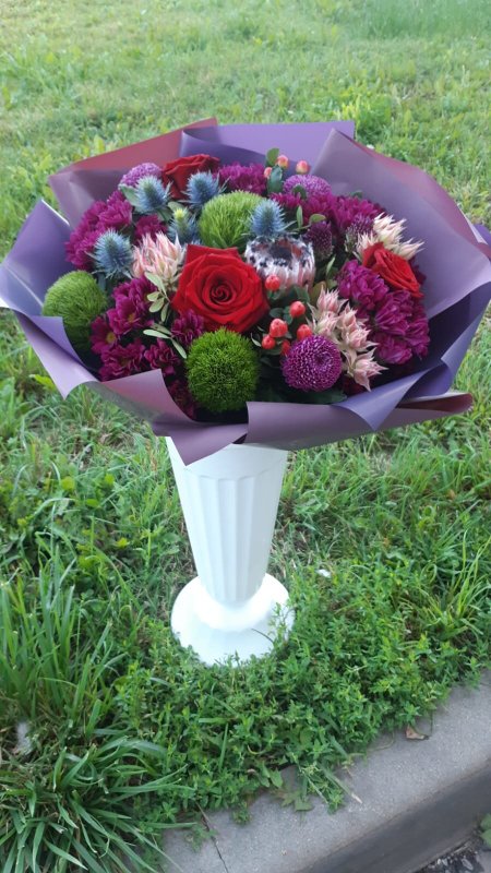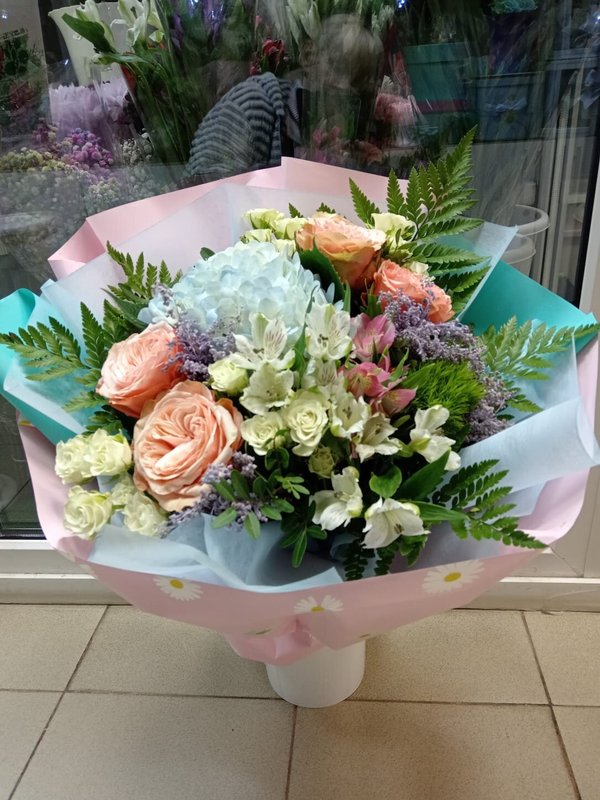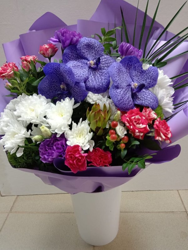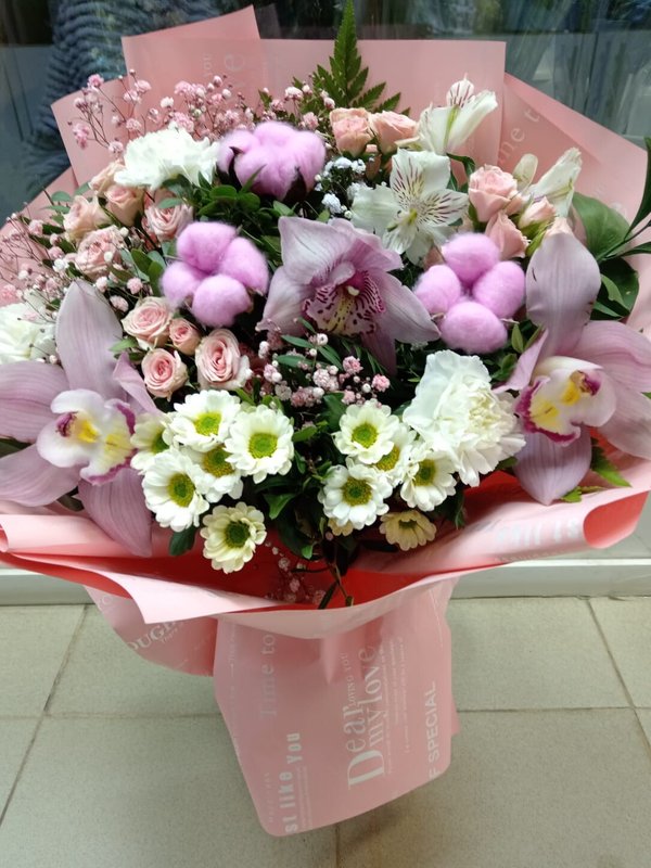 В магазине получил хорошее и дружелюбное отношение флориста, он сразу понял, что я хочу и сразу довольно быстро оформил букет. Букет на день рождения покупал, принёс фото и мне собрали что-то похожее из разных цветов. Каких-то растений не было в наличии, но флорист их заменил на другие и букет получился не менее красивым.